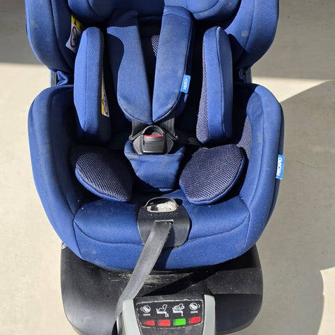 Recaro barnesete for barn opptil ca. 18 kg. Setet er i blå tekstil med integrert base og støtteben. Det har intern 5-punkts sele og justerbar rygg. Setet festes med Isofix i bilen og har indikatorer på basen som viser korrekt montering. Egnet som bakovervendt barnesete innenfor godkjent vekt- og høydeområde, avhengig av modellens spesifikasjoner fra produsent. Passer til bruk i personbil med Isofix-fester.
