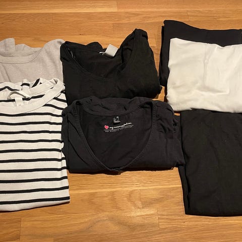 Tre gravid T-skjorter selges. Den grå og den hvite er størrelse L fra HM, mens den oransje er fra Pieces og i størrelse XL.