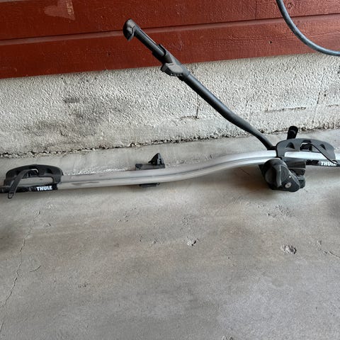 Takmontert sykkelstativ i sølv og svart. Stativet festes på takstativ/takbøyler og har hjulskinne samt arm for feste rundt sykkelrammen. Egnet for transport av én sykkel på bilens tak. Passer for de fleste standard rammetyper innenfor vanlig dimensjon og vektgrense for denne typen stativ. Laget i metall og plast med justerbare fester for sikker montering av sykkelen.