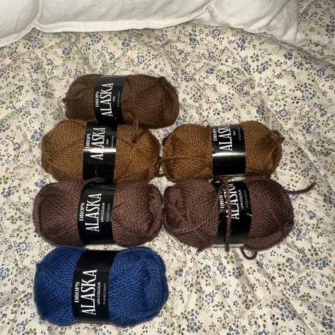 Garn nøster i blandede farger. Fire nøster i ulike farger, egnet til strikking eller hekling av mindre plagg og tilbehør. Passer til prosjekter som luer, votter, sokker eller småplagg, avhengig av garntype og løpelengde på nøstene.