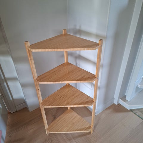 Hylle/reolsystem kjøpt på Jysk i massiv bjørk og i fargen varm eik. Sprekk i treet (bildet nr. 4) på øverste hylle, ingenting som ødelegger for bruksområde. Må hentes.
