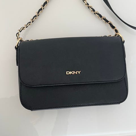DKNY skulderveske i stoff for dame. Vesken er i svart stoff med diskret logomønster og detaljer i syntetisk materiale. Justerbar skulderrem gjør at vesken kan bæres over skulderen eller som crossbody. Åpning øverst med glidelås. Metallnagler langs kantene gir et markert uttrykk. Passer til hverdagsbruk og til å frakte mindre personlige eiendeler som lommebok, mobil og nøkler.