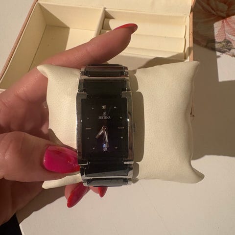 Pent brukt dameklokke fra Festina med sort skive og urkasse og lenke i rustfritt stål.