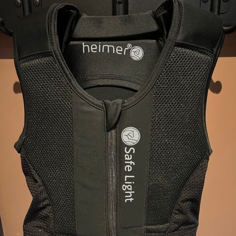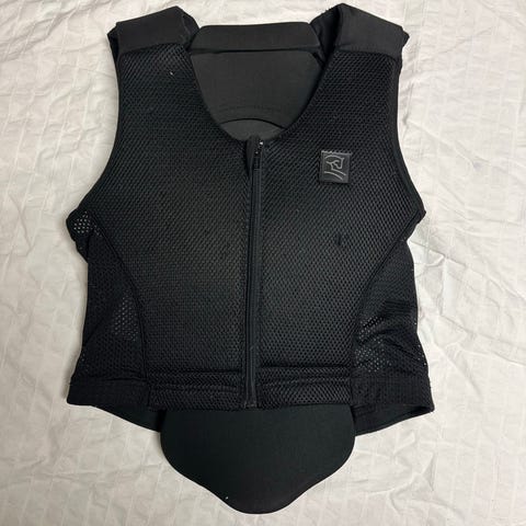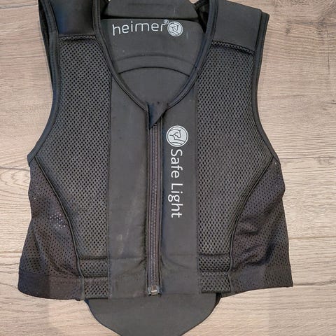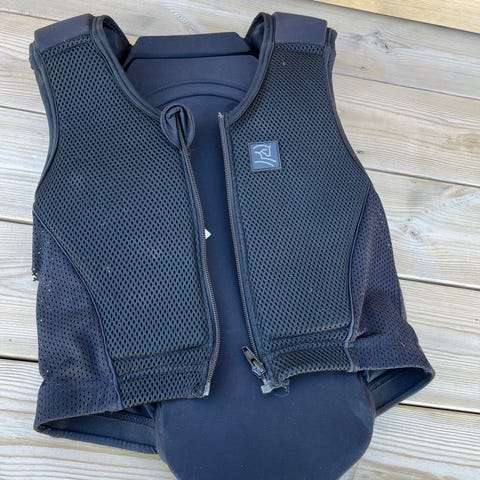Vest med glidelås foran og polstret ryggplate. Meshmateriale i deler av vesten for ventilasjon. Beregnet som ryggbeskyttelse ved ridning eller lignende aktiviteter for barnestørrelser.