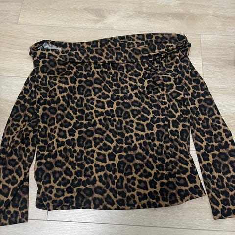 Topp, str. L, merke Mario Cotelli. stoff 95 % viskose, 5 % elastan. Leopard- og blomstermønster. Som ny, pent brukt. Kr 105 + ev. porto. Eg bruker ikkje betalings-/ sendingsløysinga Fiks ferdig.