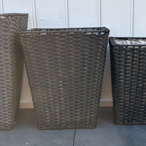 2 stk blomsterkasser i grå rotting selges , kassene har stått inne i hagestue og er meget pene.