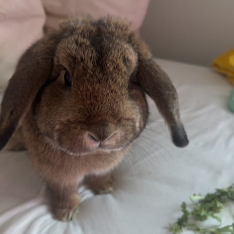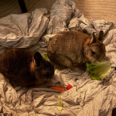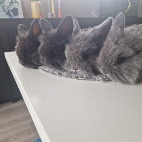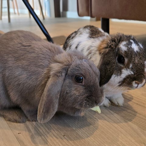 Vi er inne på tanken om å omplassere våre kjære kaniner. De lever i dag inne i en leilighet sammen med oss men leiligheten er liten og det virker som de kjeder seg, vi merker at når de får være ute så virker de gladere. De får heller ikke alltid nokk oppmerksomhet. De er snille, smarte og fotfølger deg når du går. De er godt vandt til mennesker, musikk og andre dyr og reagerer ikke på støvsuger osv. De er trygge og nysgjerrige. De er steriliserte søstre og kommer veldig godt overens med hverandre. Bur og utstyr kan følge med. Vi er litt usikre på nøyaktig hvor gamle de er da de ikke har vokst opp hos oss. Vi tok de til oss for å prøve å gi de et bedre liv og det har de absolutt fått. vi har hatt de litt over ett år og jeg tror de er 2/3 år. Den ene er kosete og rolig mens den andre er nyskjerrig og definitivt den med mest energi, de har masse personlighet og de fortjener å leve et liv hvor de kan få komme litt ut og får litt mer oppmerksomhet. De er vant til å kjøre bil, være med der det skjer og så lenge de har sengen sin så slapper de godt av overalt. De er dotrente og går stort sett i kassen sin men uhell kan skje. Det kan medfølge et to etasjers bur 60x120 på hjul, reisebur, bilbur, seng, dokasser, skåler, dopellets og litt leker. De har fått god oppfølging av dyrlege og er friske og raske. Gjerne ta kontakt hvis det er spørsmål eller interesse.