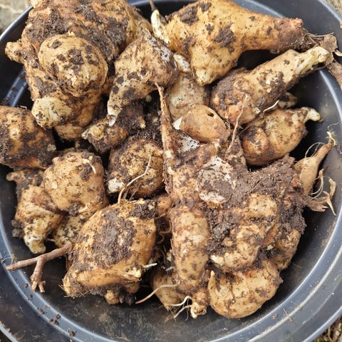 Fersk jordskokk, høstet i dag, Jordskokk knoller egnet til matlaging eller videre dyrking. Knollene kan brukes i ulike retter, som ovnsbakte grønnsaker, supper eller puré. Jordskokk kan også settes i jorden for å dyrkes som flerårig grønnsak i hage eller kjøkkenhage. Til matlaging har jeg funnet en veldig god suppe hos Gladkokken.no. Selger 100,- pr kilo for store matknoller og 60,- pr pose med 10stk til setting i jord, men disse kan også brukes som matknoller. Bruker ikke «fiks ferdig», men kan sende pr post ved kjøp over 100,- og bruk av Vipps