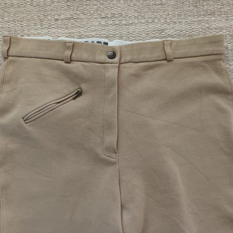 Beige ridebukse for dame. Str 44. Buksen har helforsterket sete med silikonmønster for bedre grep i salen. Den har beltehemper i livet, knapp og glidelåslukking foran, samt lommer med glidelås. Stoffet er glatt og noe stretch. Brukt maks 5 ganger. Ble for stor.