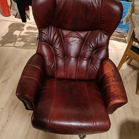 Selger to utrolig behagelige lenestoler av merket IMG, komplett med to tilhørende fotskamler. Møblene har en klassisk mørkebrun farge.