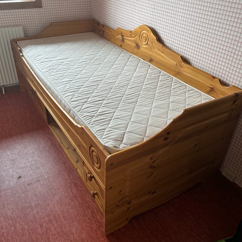 Medfølger uttrekkbar skuff (ikke avbildet) under som også kan brukes som seng eller til oppbevaring.