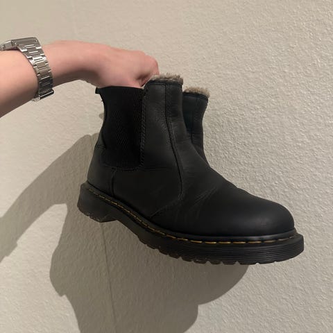Dr. Martens vinterstøvler i skinn i størrelse 39. Støvlene er svarte med karakteristiske gule sømmer og hemper bak. De har snøring foran og grov yttersåle i gummi. Innvendig er de fôret med mykt, lyst fôr som gir ekstra varme i kaldt vær. Passer som robuste vinterstøvler til hverdagsbruk.