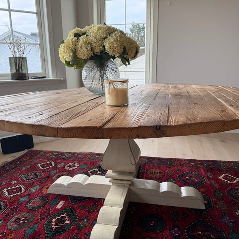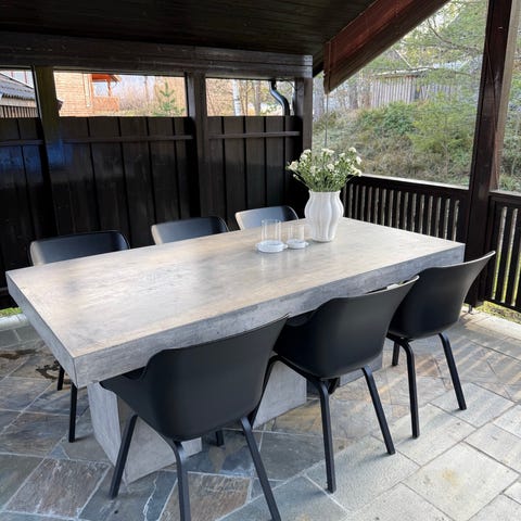 Spisebord for utendørs bruk. Bordplaten er i grått treverk, mens ben og ramme er i hvit metallkonstruksjon. Passer som hage- eller terrassebord med plass til flere stoler rundt. Egnet for bruk på veranda, terrasse eller i hage som spise- og avlastningsbord.