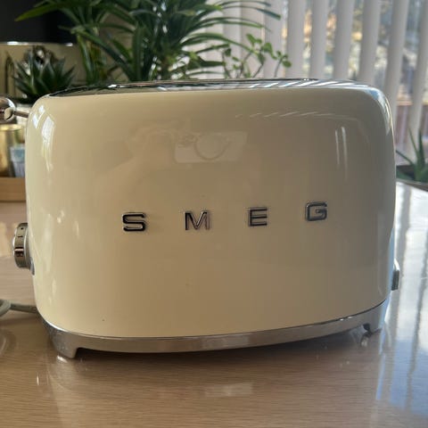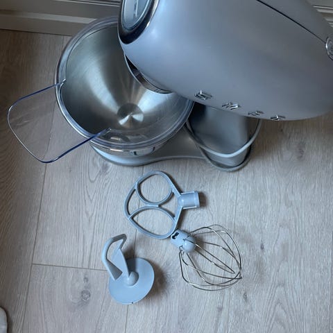 Smeg stavmikser sett i rød farge. Settet består av motorenhet, stavmikserfot i metall, visp, hakkerbeholder med lokk, målebeger/karaffel med håndtak og potetstapper-tilbehør.