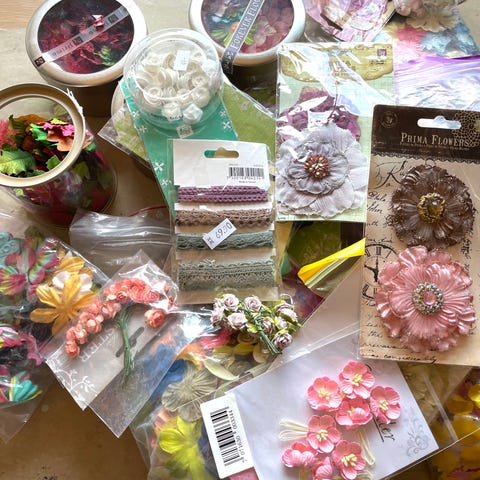 Diverse bånd, blonder og søte applikasjoner til scrapping og junk journal