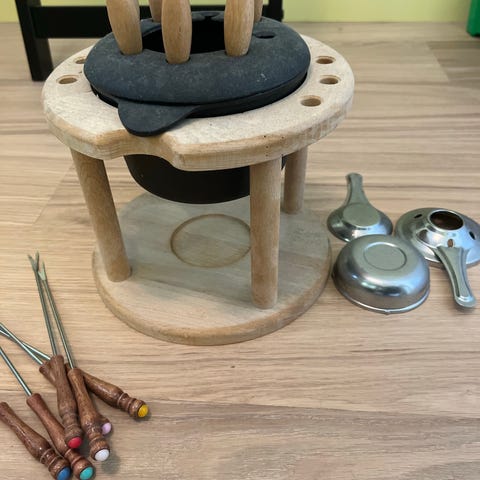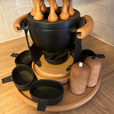 Komplett brukt fondue-sett i kobber, med stort kobber-brett og brenner for rødsprit.