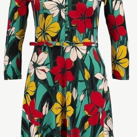 King Louie sommerkjole for dame i størrelse 40 med lommer! Kjolen er laget av viskose og har et flerfarget blomsterprint. Den har korte ermer, knapper i front og knytebelte i livet. Passer som lett og behagelig kjole til varme dager eller sommerbruk.