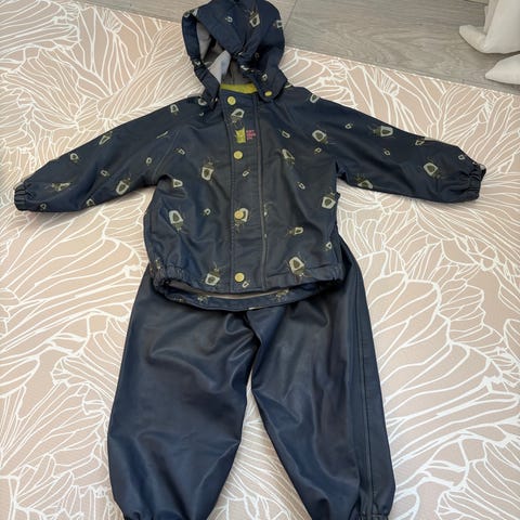 Pent brukt regnsett i str.98 brukt til ett barn. God regnsett uten hull eller merker. Det mangler fotstrikker. 🌸