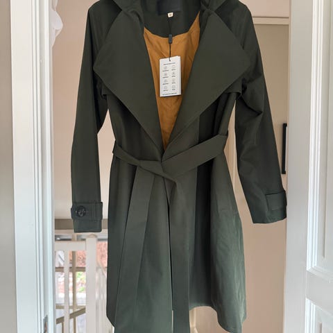 BRGN kåpe for dame i størrelse S. Kåpen er i fargen kamel. Modellen har belte i livet, stor krage og knepping foran. Den har glidelåslomme på innsiden og ventilasjonsklaff bak. Hette i kragen. Nesten ikke brukt.