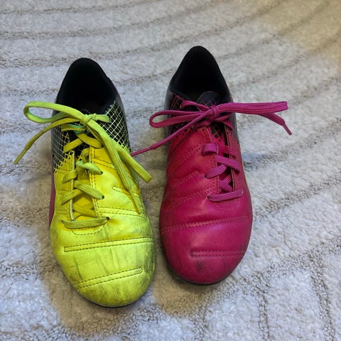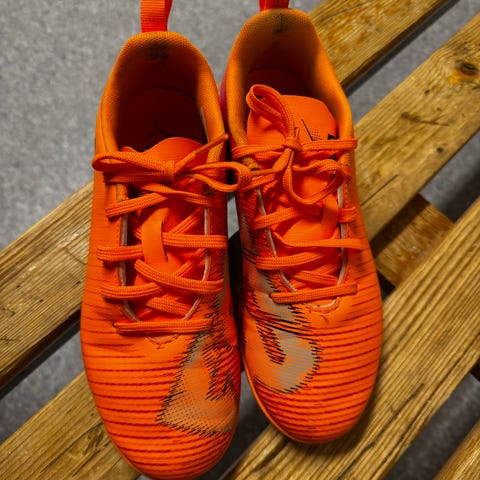 Puma fotballsko med knotter i hvit farge med rosa detaljer. Skoene har snøring foran og yttersåle med faste knotter til bruk på gress eller kunstgress. Overdel i syntetisk materiale som er lett å rengjøre. Passer til fotballspillere som trenger lette sko med godt grep på banen. Skoene er godt brukt 1 sesong. Størrelse 34.