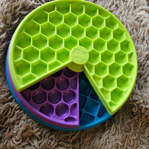 Hunden snurrer de tre lagene for å få mat eller godbiter! Matsikker plast, over 100 hull for mat eller hundegodbiter.