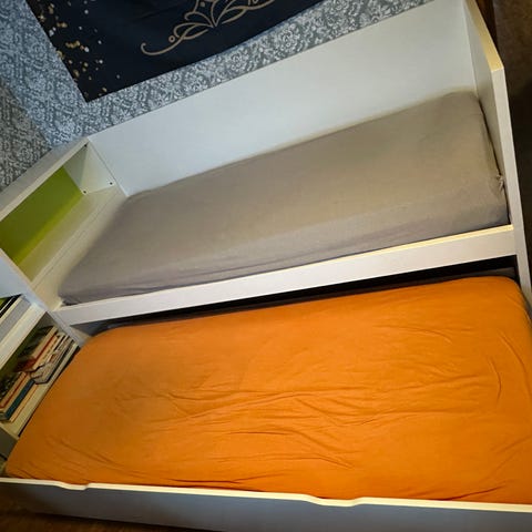 Brukt eldre modell av Sebra seng uten hev/senk funksjon. Noen bruksmerker. Noen av plastskruene knekt, men går ann å bruke som det er eller bestille reservedeler fra fabrikken. Står demontert. Selges grunnet flytting og overgang til større seng. Madrassen med madrassforlenger følger med. Mye bruk igjen. Må hentes
