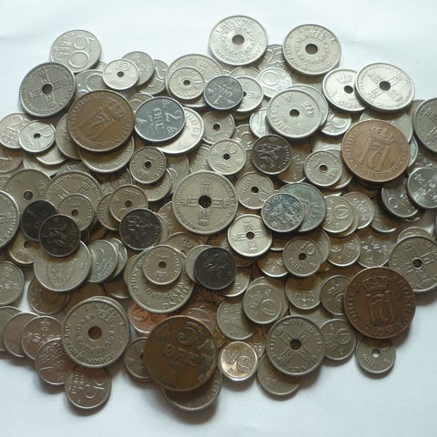 Har godt utvalg av norske mynter, spesielt fra Olav 5 og Haakon 7. Bildene er bare eksempler, har også mye som ikke er pakket opp ennå. Kom gjerne med forespørsler, eller send meg mankoliste, så kan jeg returnere bilder av det jeg har som er relevant. Har også en del kg uåpnede ruller og kan tilby 1 øre fra 1968 og 10 øre fra 1970 fra ruller som er åpnet. Prising: Forslag med 50% av prisene i Norges mynter 2026. Kjøper du mange, får du ekstra gode priser. Frakt, til norske adresser kommer i tillegg.