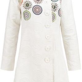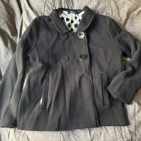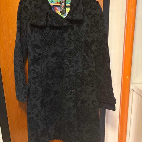 Sort kåpe fra desigual i flott brokadestoff med blomstermønstret struktur. Kåpen selges fordi jeg ikke passer den lengre. Den har lett utsvingt fasong nederst og er veldig fin på!