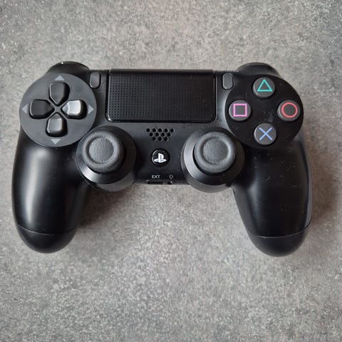 Sony DualShock 4 kontroller i svart. Trådløs håndkontroller til PlayStation 4 med innebygd berøringsflate, lysstripe, høyttaler og hodetelefonutgang. Kontrolleren har to analoge styrespaker, retningsknapper, fire hovedknapper, skulderknapper og Share/Options-knapper. Egnet for bruk med kompatible PlayStation 4-konsoller og enkelte andre enheter som støtter DualShock 4.