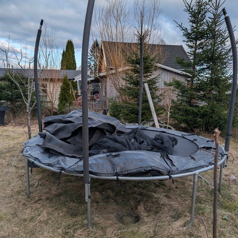 Gir bort vår trofaste trampoline. Som bildene viser er den godt brukt og bærer preg av vær og vind, men la deg ikke lure av utseendet!