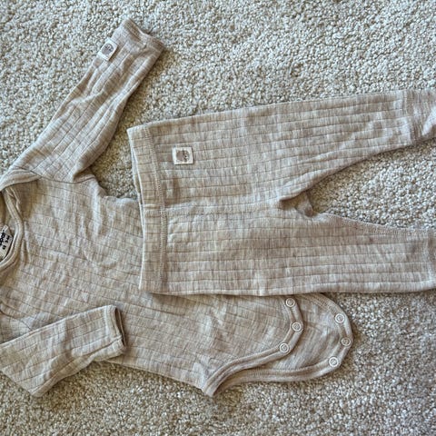 Name it babysett med body og bukse i størrelse 62. Sett i myk bomull i varmgrå farge, unisex-modell. Body med lange ermer, knappestolpe foran og trykknapper i skrittet. Matchende bukse med strikk i livet.