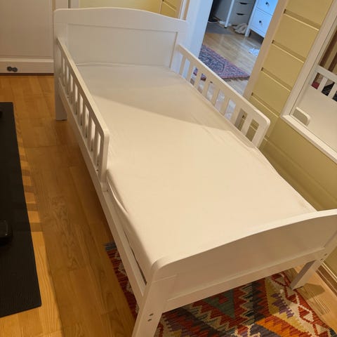Juniorseng til salgs. Er litt usikker på om det er madrass med. Kjøpt i 2024