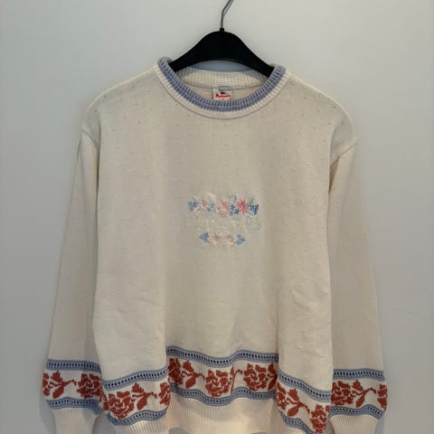 Selger en veldig pent brukt og unik half-zip genser fra Vianni. Er størrelse L, og lang i lengden. Genseren er vintage og rett fra 90-tallet! På ryggen er det brodert tre Teddy bjørner, gir litt Polo Bear Ralph Lauren-vibes. Står «Traditional family clothes» under!