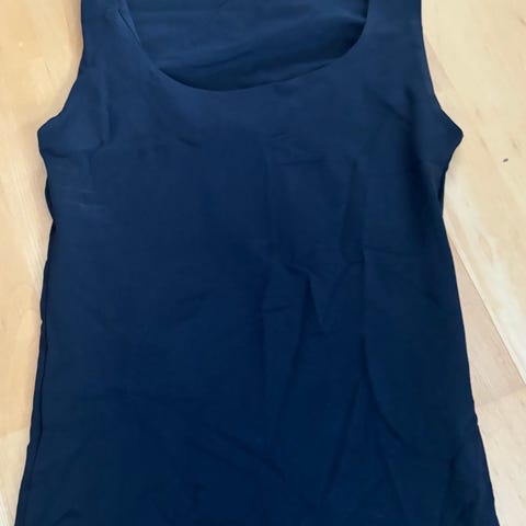 Vero Moda topp for dame i størrelse M. Enkelt, ermeløst design med rund hals. Toppen er svart og laget i 86% polyester og 14% elastan, som gir et lett og glatt materiale. Passer til hverdagsbruk eller som lag under andre plagg, kan brukes begge sider, om du vil ha lav utringet eller høy utringet.Kun prøvd, men lappene ble tatt av før den ble prøvd på.