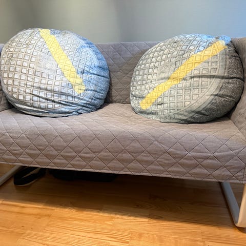 Liten sofa fra Ikea som jeg ikke tror de selger lenger. Trekket kan vaskes i maskin (nettopp vasket). Brukt på barnerom.