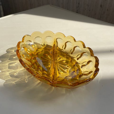 Glassfat og skål med bølgekant i grønn og gul farge. I flott stand