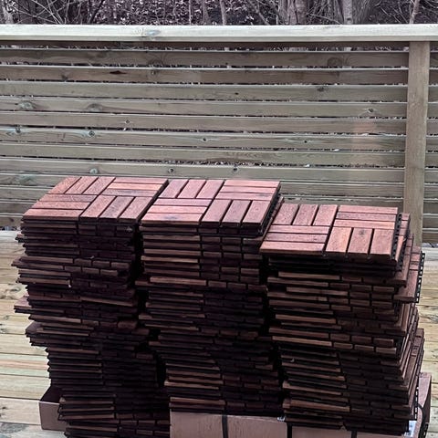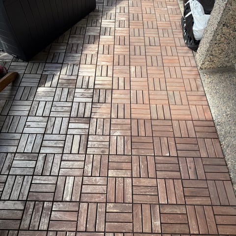Gulvplatene er pent brukt på en balkong med tak over. De har ligget ute både sommer og vinter. Ingen nevneverdige skader. De ble rengjort ved demontering. Den lys grå fargen selges ikke lenger.