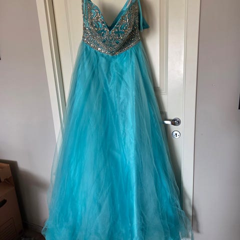 Hei, leier ut denne fine ballkjolen her som bare har blitt brukt 1 gang på skoleball. Kjolen er sydd opp fordi den var litt for lang, jeg er 158 og den passer perfekt men passer ca 158-163. Underskjørt følger med i prisen. Dersom kjolen blir ødelagt må den erstattes med å betale full pris.