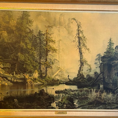 Chr. Skredsvig «Jupsjøen» bilde med landskapsmotiv. Reproduksjon etter maleri fra 1917, ifølge messingplakett på rammen. Motivet viser innsjø med båt i forgrunnen, omgitt av skog og fjell i bakgrunnen.