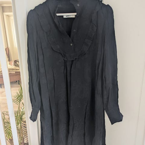Sofie Schnoor midi hverdagskjole for dame i størrelse M. Kjolen er svart med allover bladmønster i kontrastfarger. Den har lange ermer med mansjett og knappelukking foran øverst. Produsert i polyester, med lett og fallende kvalitet. Passer som hverdagskjole eller til enkle, pyntede anledninger. Lett for i kjolen bortsett fra i armene, som gjør den lett gjennomsiktig og ekstra fresh.