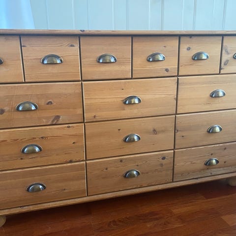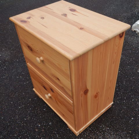Kommode i furu med fem skuffer. To mindre skuffer øverst og tre større skuffer under gir god oppbevaringsplass. Tradisjonelle håndtak i metall. Passer til soverom, stue eller gang for oppbevaring av klær, tekstiler eller andre gjenstander.