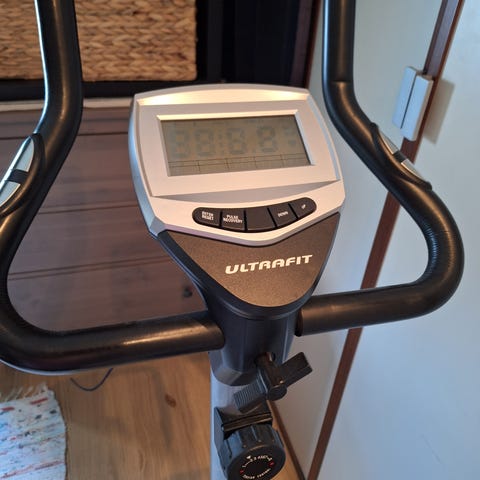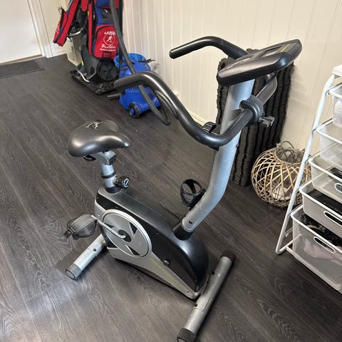 Trimsykkel med treningscomputer og justerbart sete. Sykkelen har styre med håndtak foran, pedaler med fotstropper og display som viser treningsdata som tid, distanse og hastighet. Egnet til innendørs kondisjonstrening og lett mosjon. Passer for voksne brukere, og kan brukes både til rolig sykling og mer intensiv trening avhengig av motstandsinnstillingene på sykkelen.