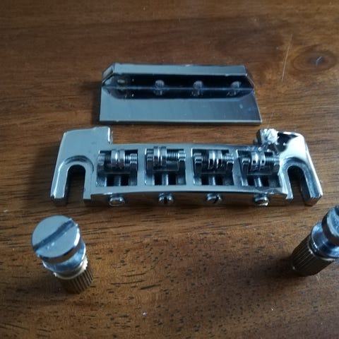 Selger komplett Tuneomatic Tailpiece og bridge med plugger fra Tonepros. Passer Les Paul og andre gitarer med LP system. Kjøpte disse fra Gitarist.no for 2250kr men synes ikke gull passet min gitar kosmetisk. Disse har Tonepros sitt låsesystem med setskruer som låser tailpiece og bridge for å eliminere minste bevegelse av dem. Det er bruksmerker på tailpiecen der den er under skruen/ kontaktflaten mot skruehode (bilde 4) men det synes naturligvis ikke når den er montert på da det er under skruehode.