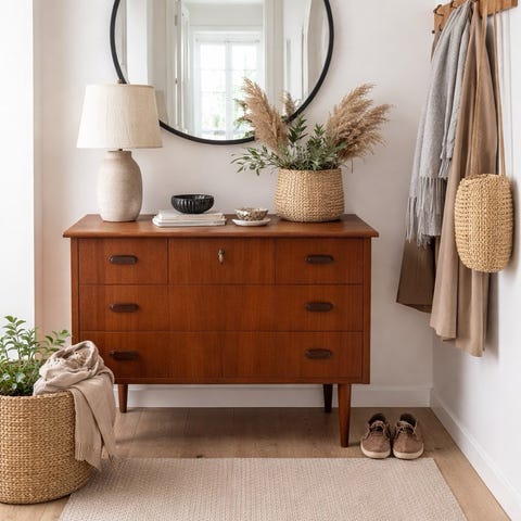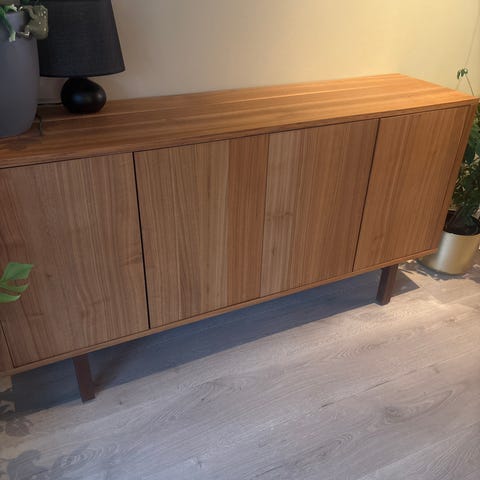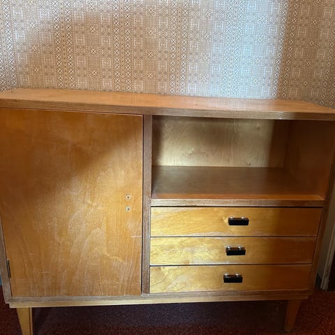 Skjenken trenger litt kjærlighet, men ingen store skader. Dør på høyre side har løsnet i hengslet, men dette kan fikses med et par litt større skruer.