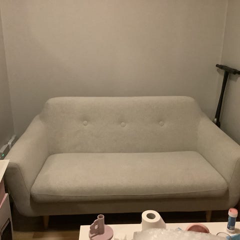 Pent brukt uten merker. Nylig renset. Avtrekkbare puter som kan vaskes i maskinen. Ben i metall.