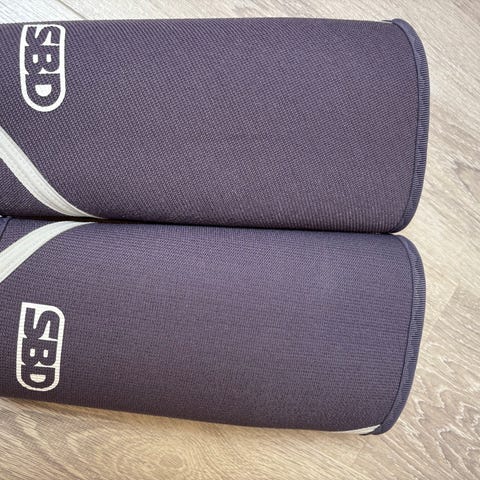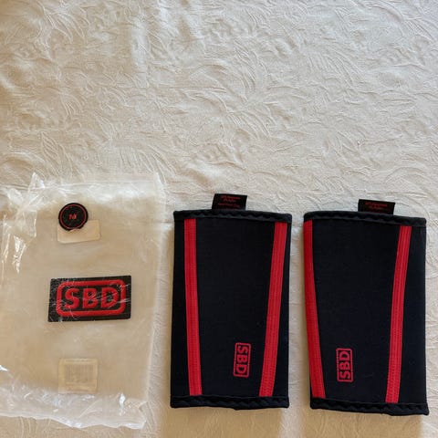SBD knevarmere i størrelse XL. Farge svart med røde detaljer. Knevarmerne er laget i et elastisk, komprimerende materiale som gir støtte rundt kneleddet under styrketrening og andre belastende aktiviteter. Selges som et par. Disse er godkjent av det internasjonale styrkeløftforbundet, og kan dermed brukes i konkurranse. Disse er ikke brukt, kun prøvd på og fremstår som nye.