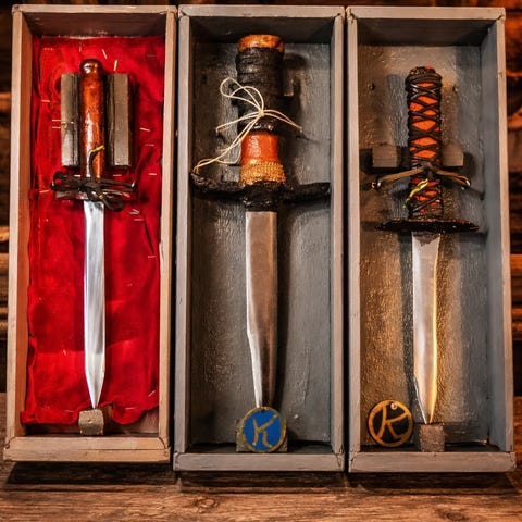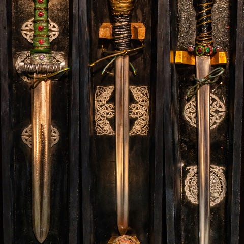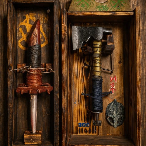 Dekorativ veggdekor med norrøne symboler og våpenmotiv. Motivet viser blant annet runeinspirerte symboler og et triskel-/knutemønster, samt detaljer som etterligner tradisjonelle våpen. Passer som tematisk innredning i rom med middelalder- eller vikinginspirert stil. Egnet som veggpynt i stue, kontor, spillrom eller lignende miljøer der man ønsker et norrønt preg.