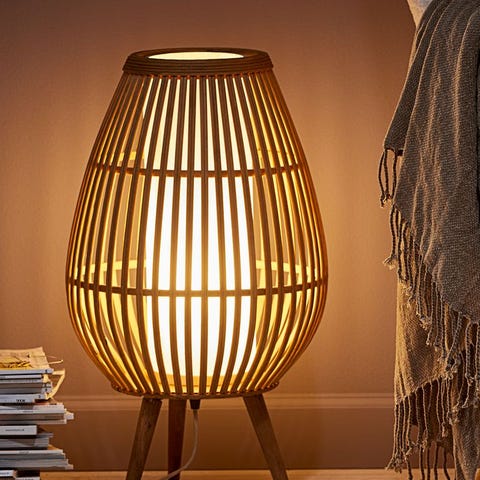 IKEA bordlampe i flettet bambus i naturfarge. Lampen har sylinderformet skjerm med flettemønster som gir et varmt og filtrert lys. Den står på integrerte ben i samme materiale, og har hvit ledning med bryter. Egnet som stemningsbelysning på bord, hylle eller nattbord. Bruker standard lyspære med sokkel som passer til vanlig bordlampe (se merking på lampeholder for riktig type og maks watt).