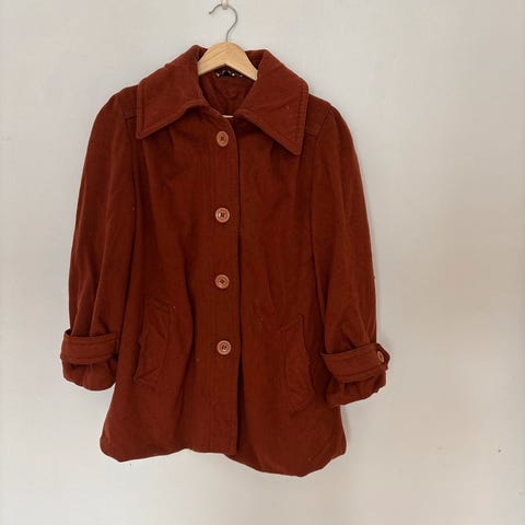 Damejakke i polyester i rød/ orange farge, størrelse 46. Jakken har høy krage med trykknapper. Skult glidelås hele veien i front. Den har to utvendige lommer med glidelås . En innerlomme med knappelukking. Kragen kan brettes ned, eller kneppes med trykknapper, så den blir høyere.