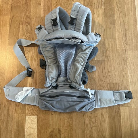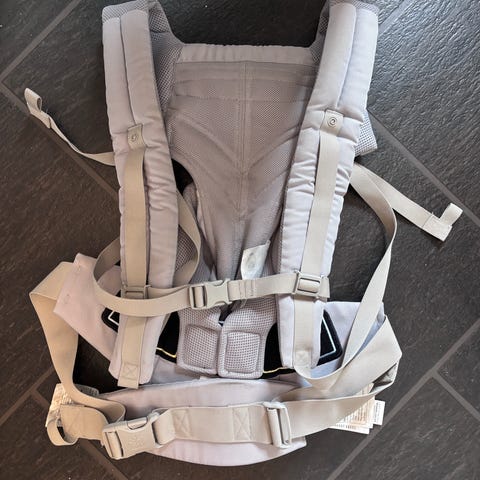 Ergobaby bæresele i grå farge. Selen har polstrede skulderstropper og bred, justerbar hoftereim med borrelås og spennelukking. Den har støtte for barnets hode og nakke, samt polstret seteområde. Flere justeringsmuligheter gjør at selen kan tilpasses bruker og barn. Egnet til bæring av baby/barn på mage eller rygg, avhengig av modellens funksjoner og barnets størrelse og vekt. Materiale er mykt tekstil med polstring for økt komfort.